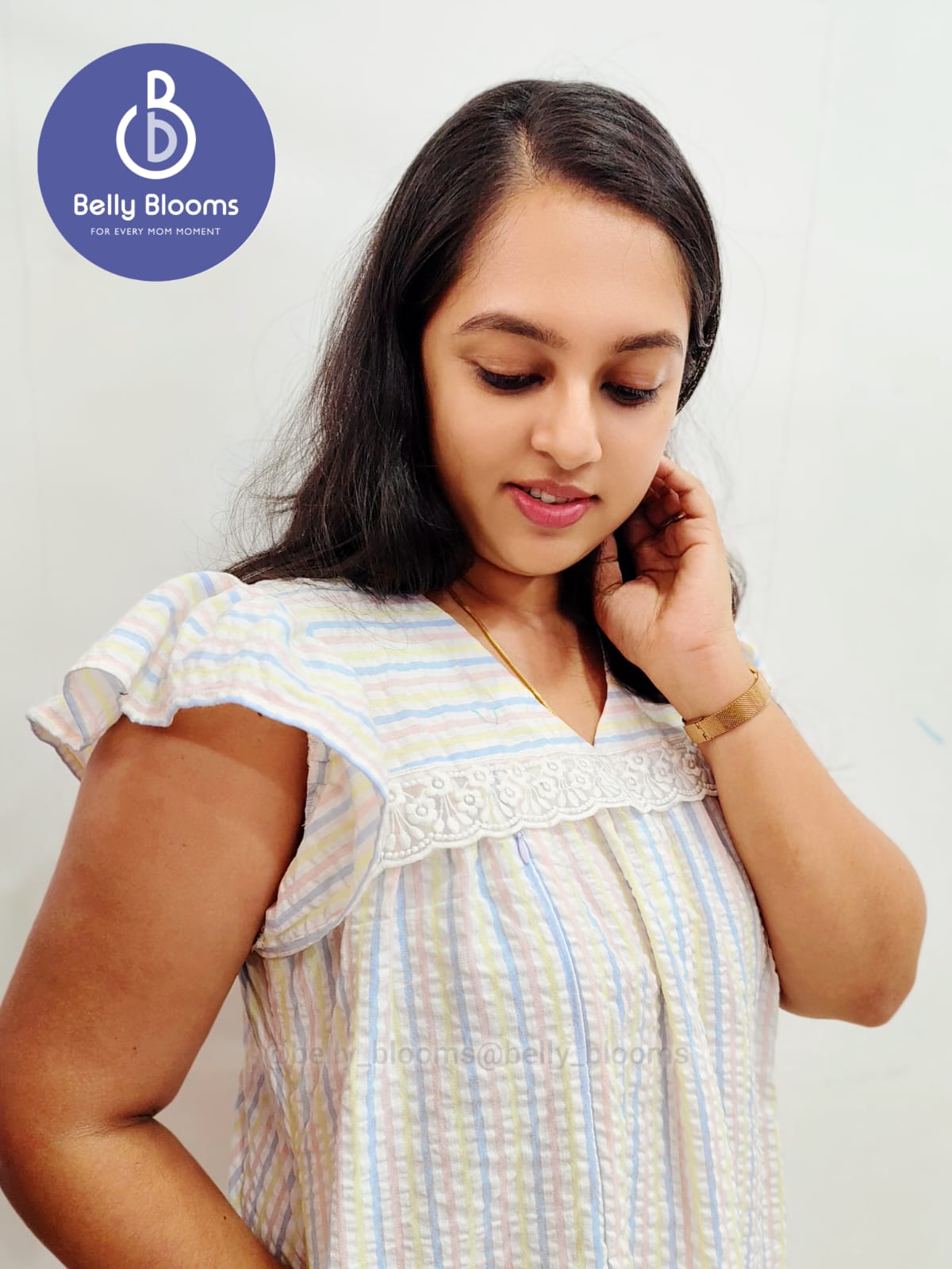 Experience unmatched comfort and effortless style with this soft striped check feeding nighty, thoughtfully designed for nursing mothers. Made from breathable cotton fabric, it ensures all-day comfort and gentle care for sensitive skin.The nighty features a classic striped check pattern in soothing tones, giving it a timeless and elegant look. Designed with discreet nursing zippers on both sides, it offers easy and convenient feeding access, making it a must-have for both pregnancy and postpartum days.Adding a touch of grace, the lace-detailed yoke elevates the overall aesthetic, while the flutter sleeves provide a relaxed, breezy silhouette—ideal for restful nights and relaxed days.