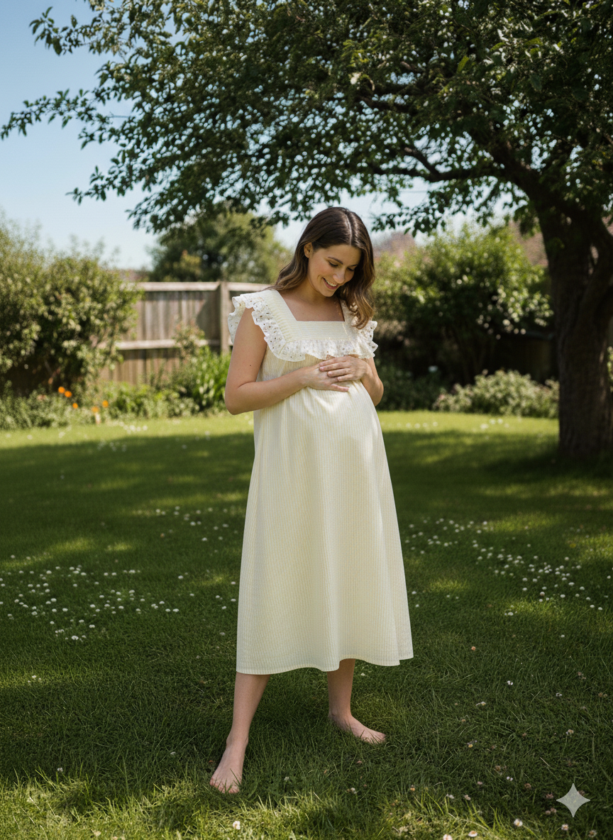 Step into effortless elegance and all-day comfort with this beautifully crafted yellow check feeding nighty. Made from lightweight, soft seersucker cotton fabric, it offers a gently textured feel that’s breathable and perfect for warm weather.Designed with a square neckline, the yoke is adorned with delicate hakoba adding a subtle touch of grace and femininity. The nighty features hidden zippers on both sides for convenient nursing access, making it a functional yet stylish choice for new moms.The 3/4 sleeves provide comfortable coverage while maintaining ease of movement, and the cheerful yellow check pattern brings a fresh, bright vibe to your maternity wardrobe.