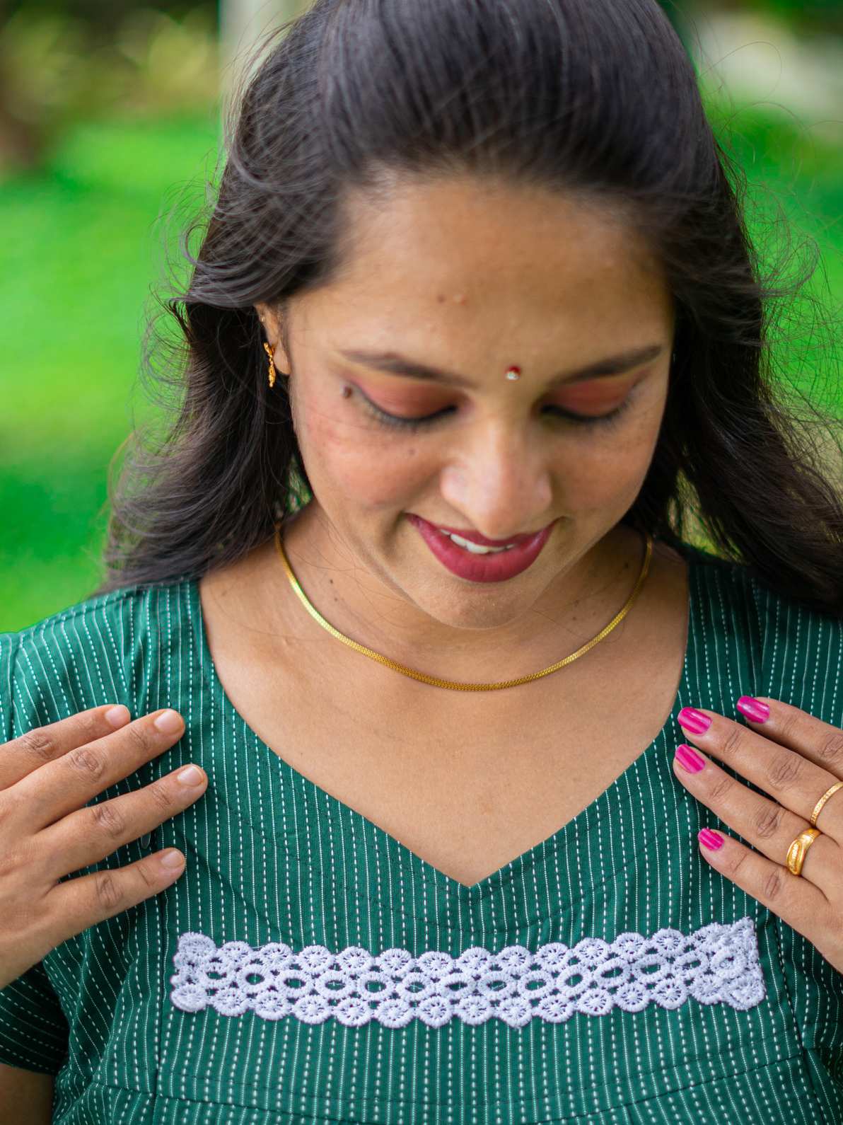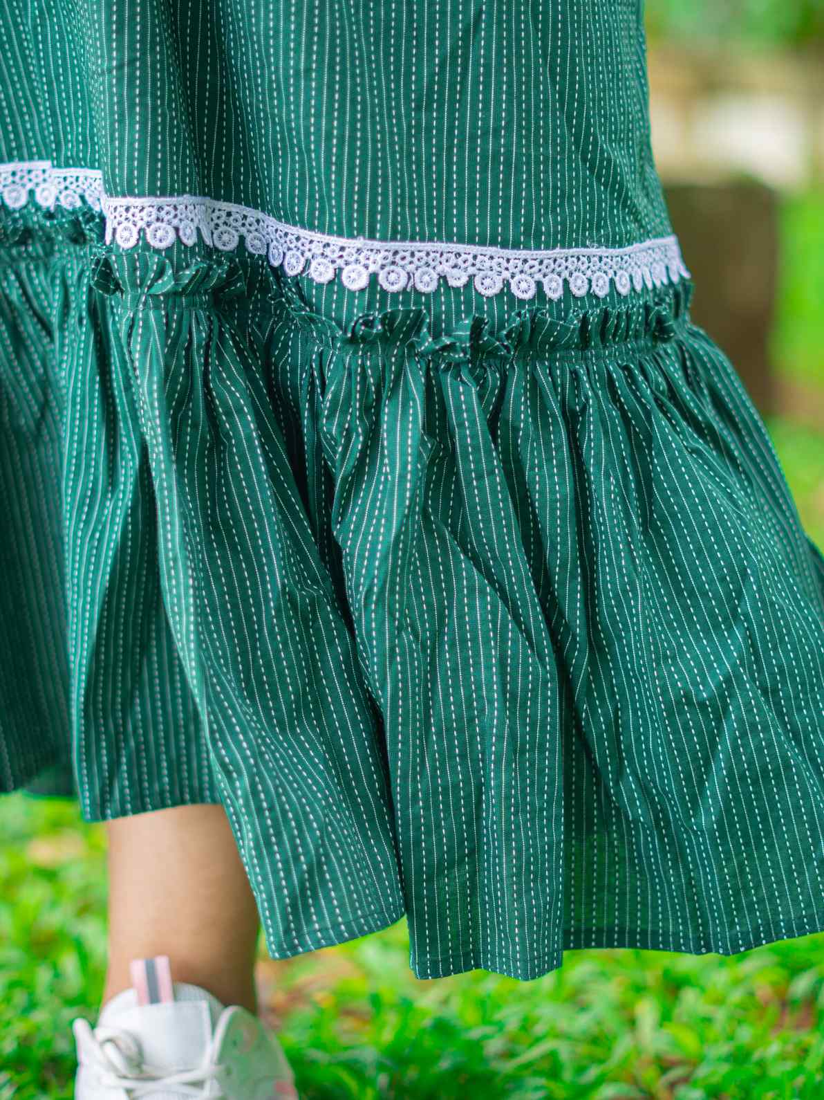 Experience the luxury of our premium pure Kantha bottile green cotton dress, designed with both style and functionality in mind. This feeding-friendly dress features cap sleeves and two convenient pockets. The same color bottom frills add a subtle touch of elegance, while the back tie ensures a customizable fit. Adorned with intricate lace detailing on the yoke and hem, it exudes sophistication. With a length ranging from 48 to 50 inches, this dress offers a versatile fit, making it an ideal choice for a variety of occasions.