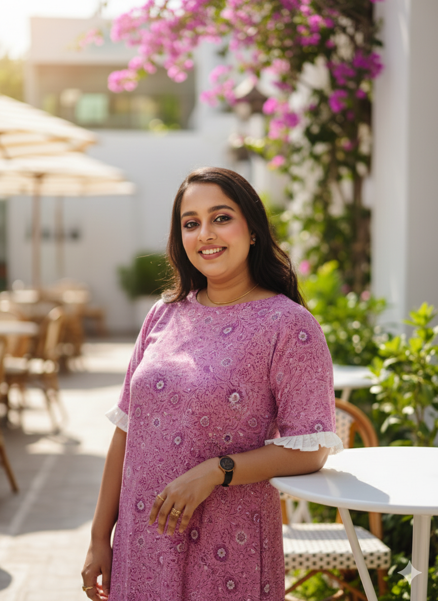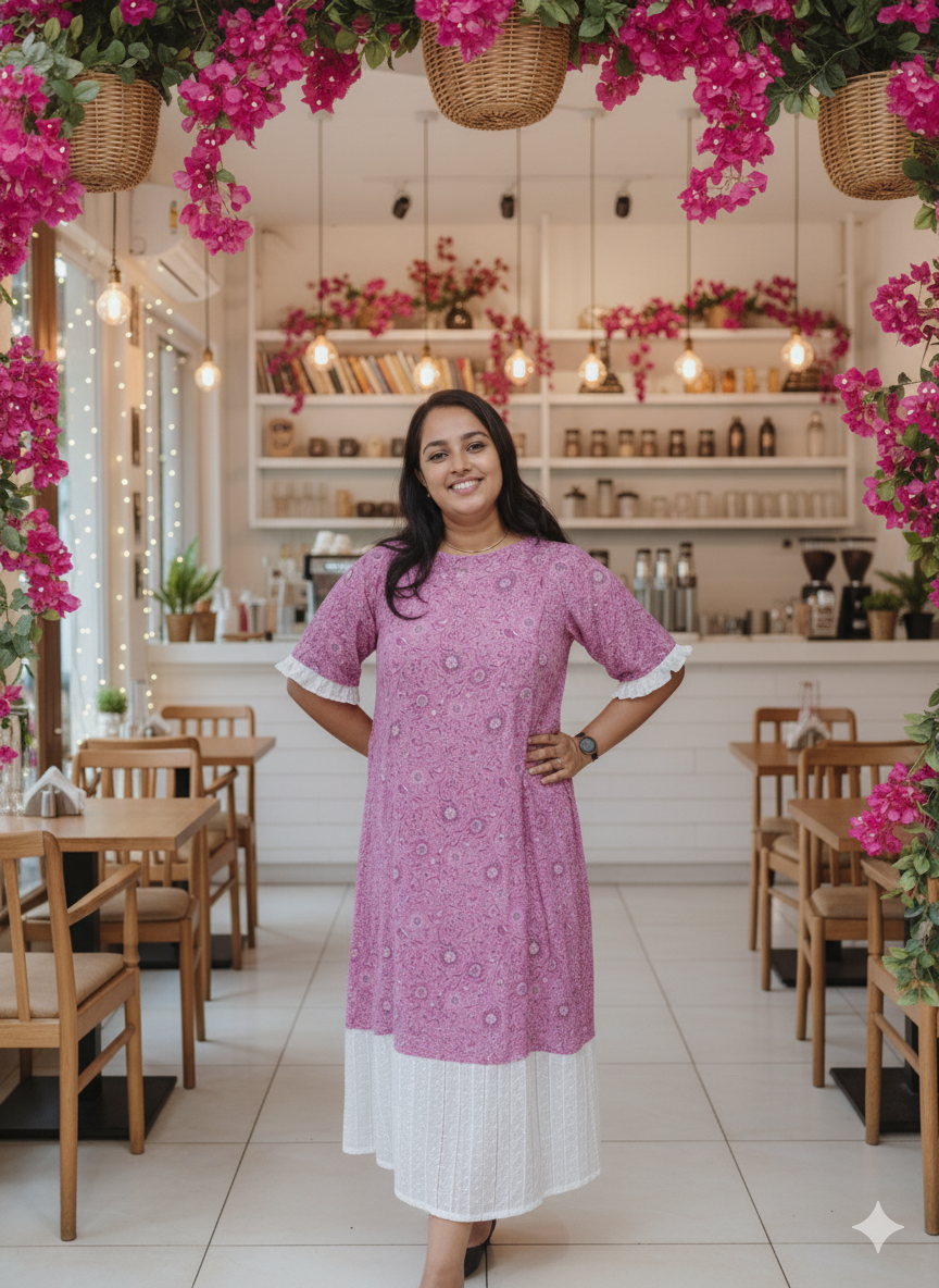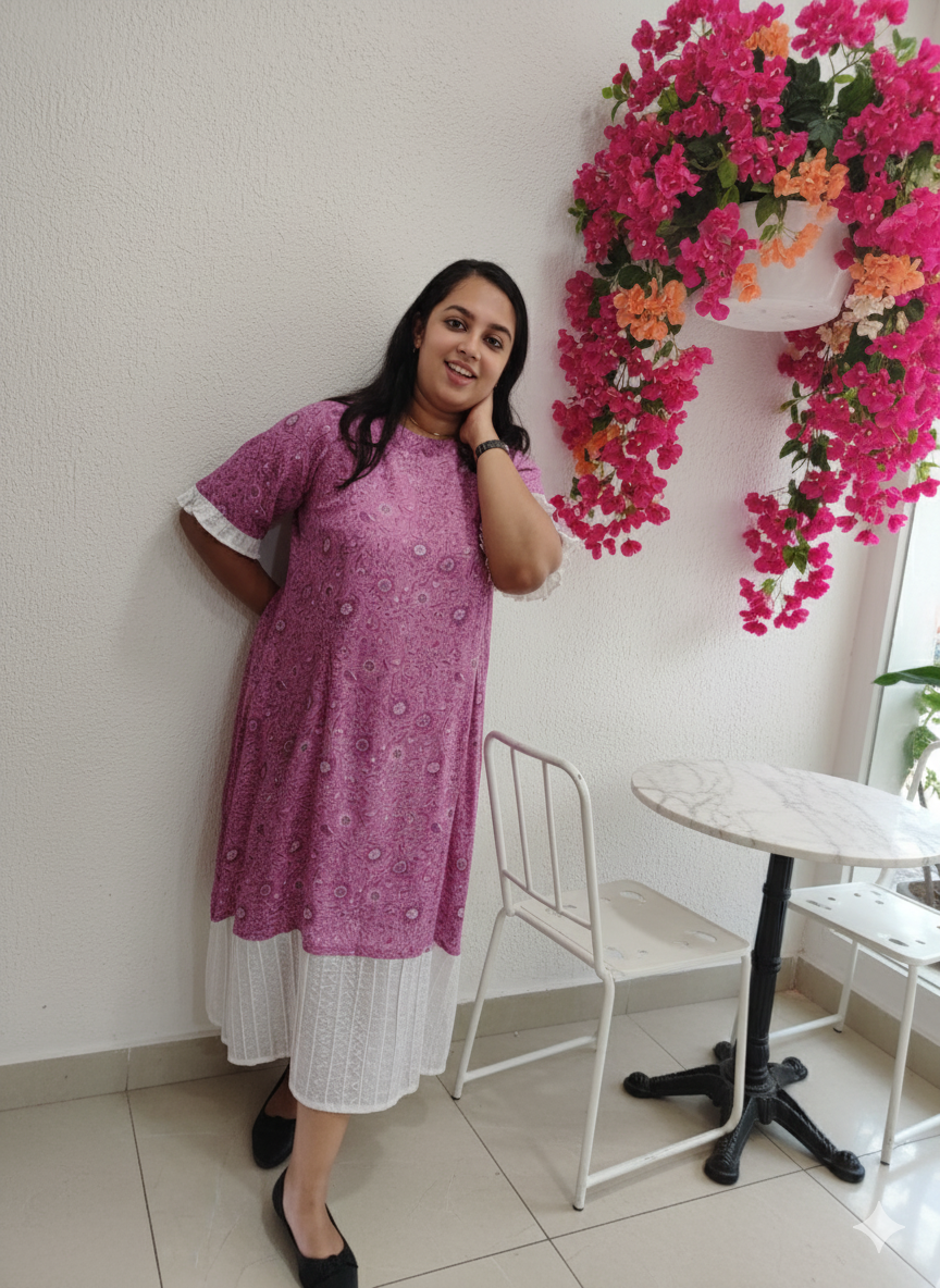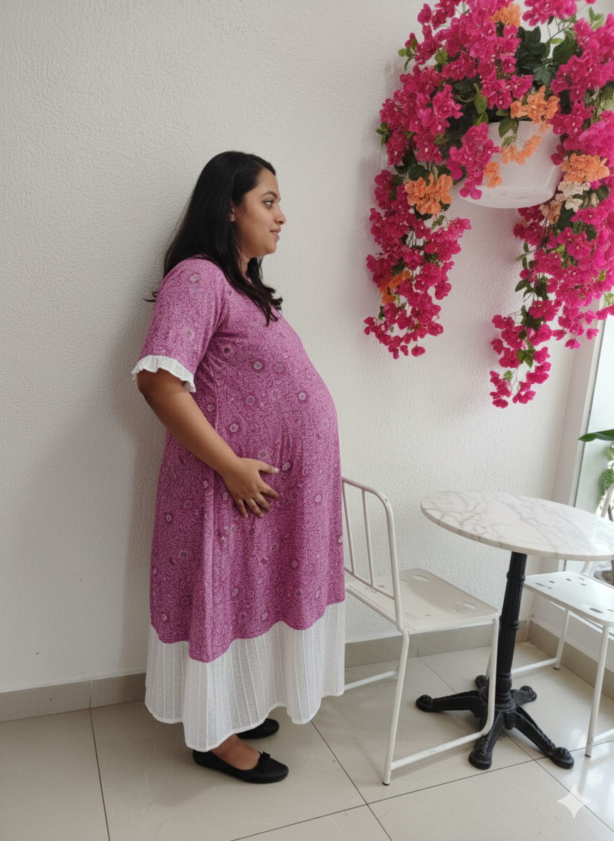 Soft, stylish, and thoughtfully designed, this pink A-line feeding kurta is the perfect blend of elegance and comfort for new and expecting mothers. Crafted from breathable cotton, the kurta features all-over hakoba detailing that adds a delicate, feminine charm to the look.The square pintucked yoke offers a structured yet graceful finish, while functional zippers on both sides ensure discreet and convenient nursing access. Subtle hakoba frills at the sleeve ends add a playful touch to the design.With its A-line silhouette, this kurta drapes comfortably over the body, making it ideal for maternity wear, postpartum dressing, or casual day outings.