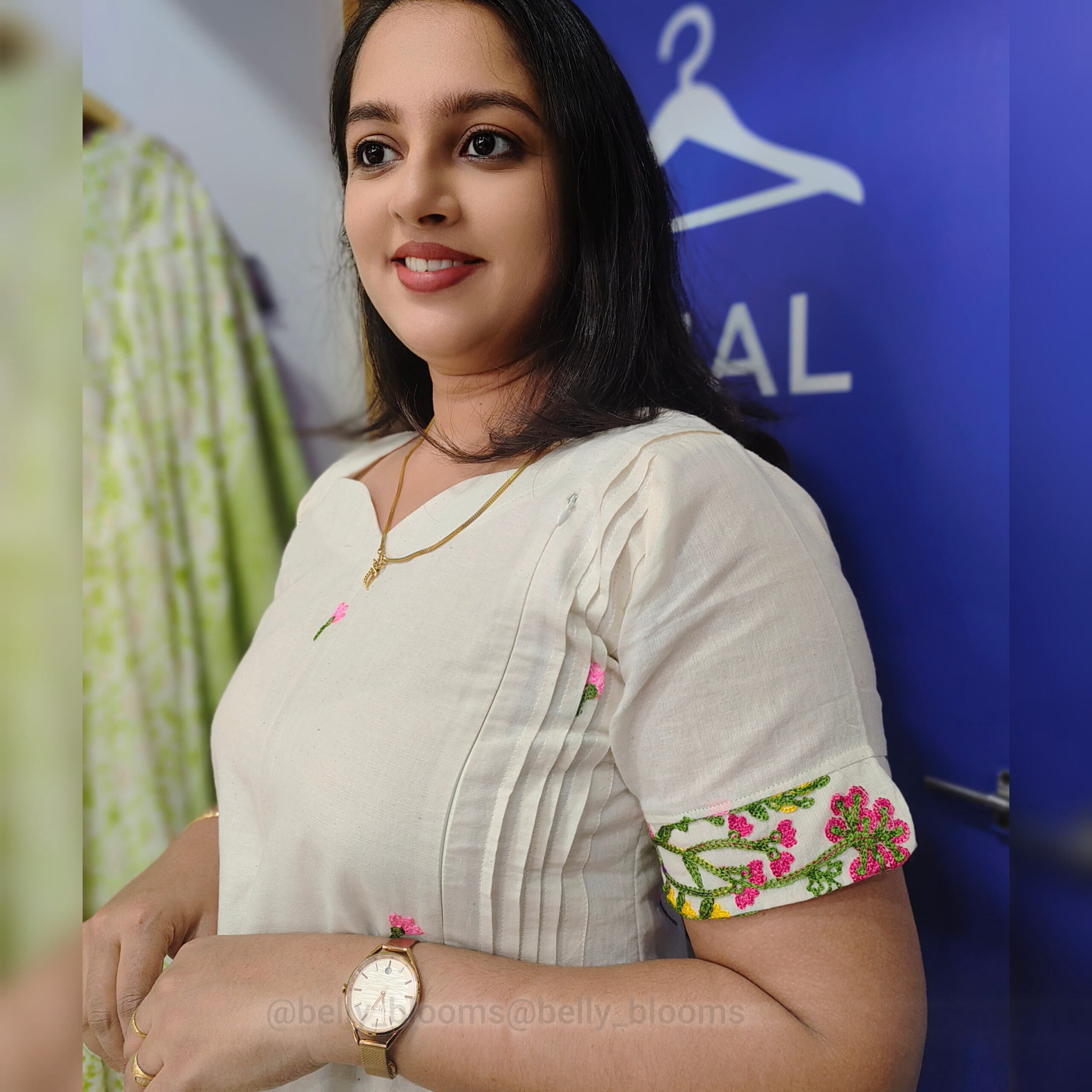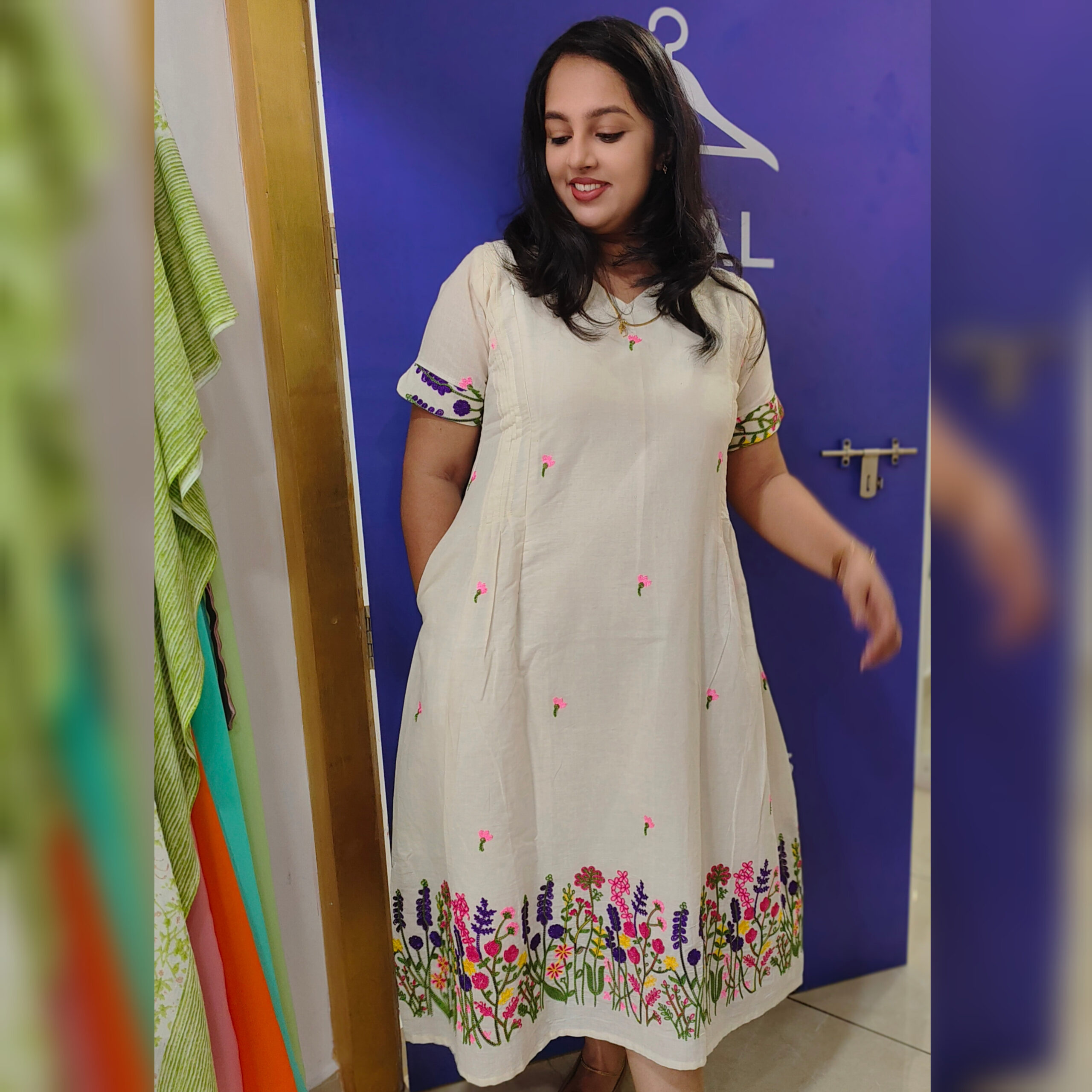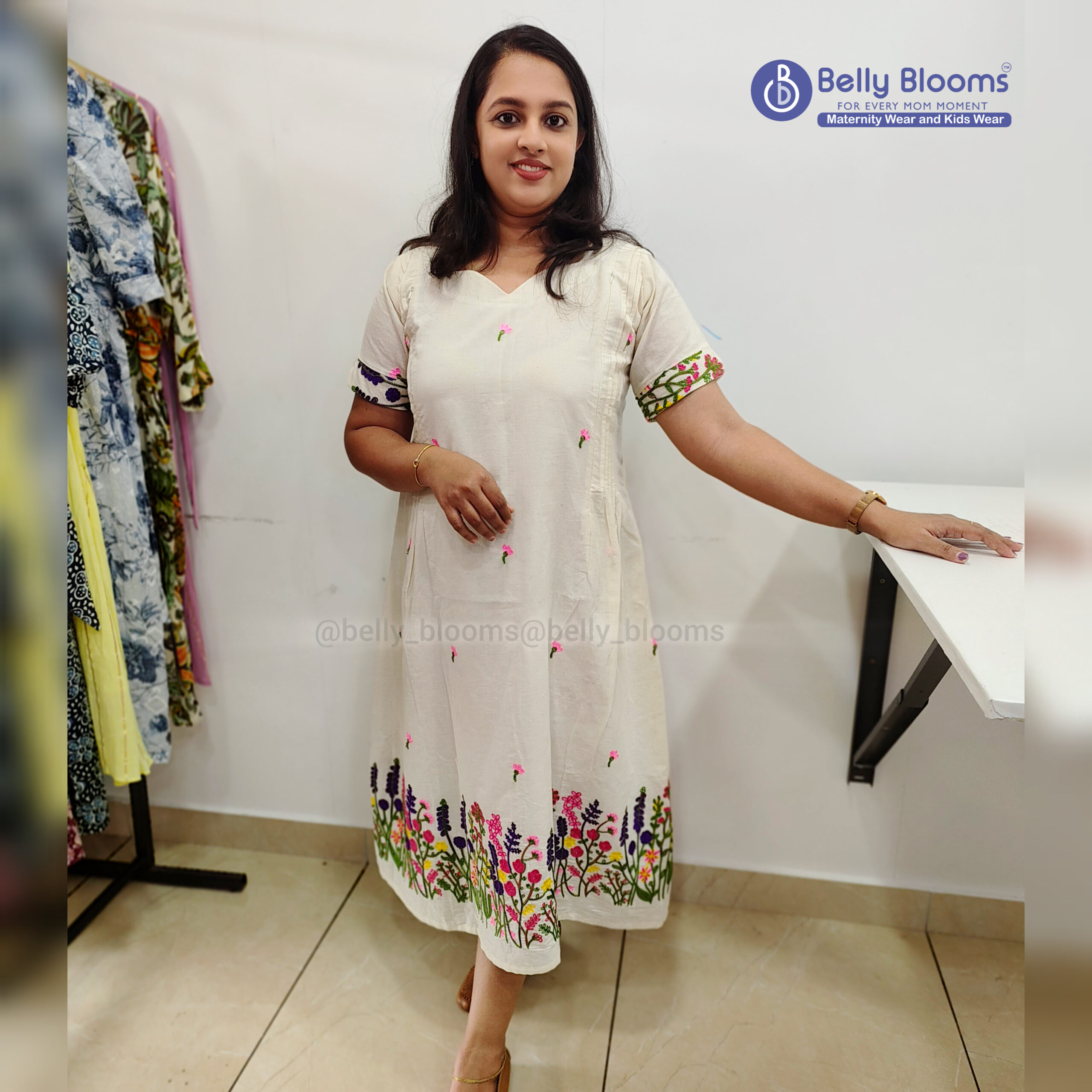 Step into the season of flowers with our Onam special collection.Featuring kora cotton slub fabric,vibrant floral embroidery and feeding-friendly – perfect for your festive moments.Model wears our floral Onam midi from the “Ammakkoru Onakodi” collection.