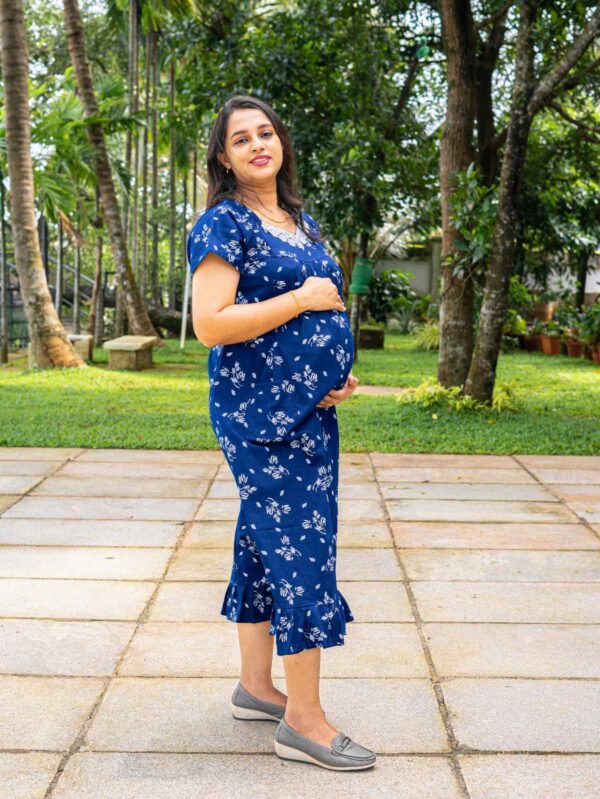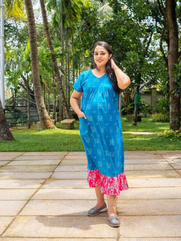 Elevate your wardrobe with this timeless piece made from 100% pure cotton, ensuring comfort and breathability. This dress features a classic design with both sides feeding for added convenience. It comes with a normal sleeve patterns have sleeve length 3.5 to 5 inches it depends for a relaxed fit and includes a practical single pocket. The same color bottom frills add a touch of elegance, while the back tie provides a customizable fit. Perfect for any occasion, this versatile dress combines style and functionality seamlessly.