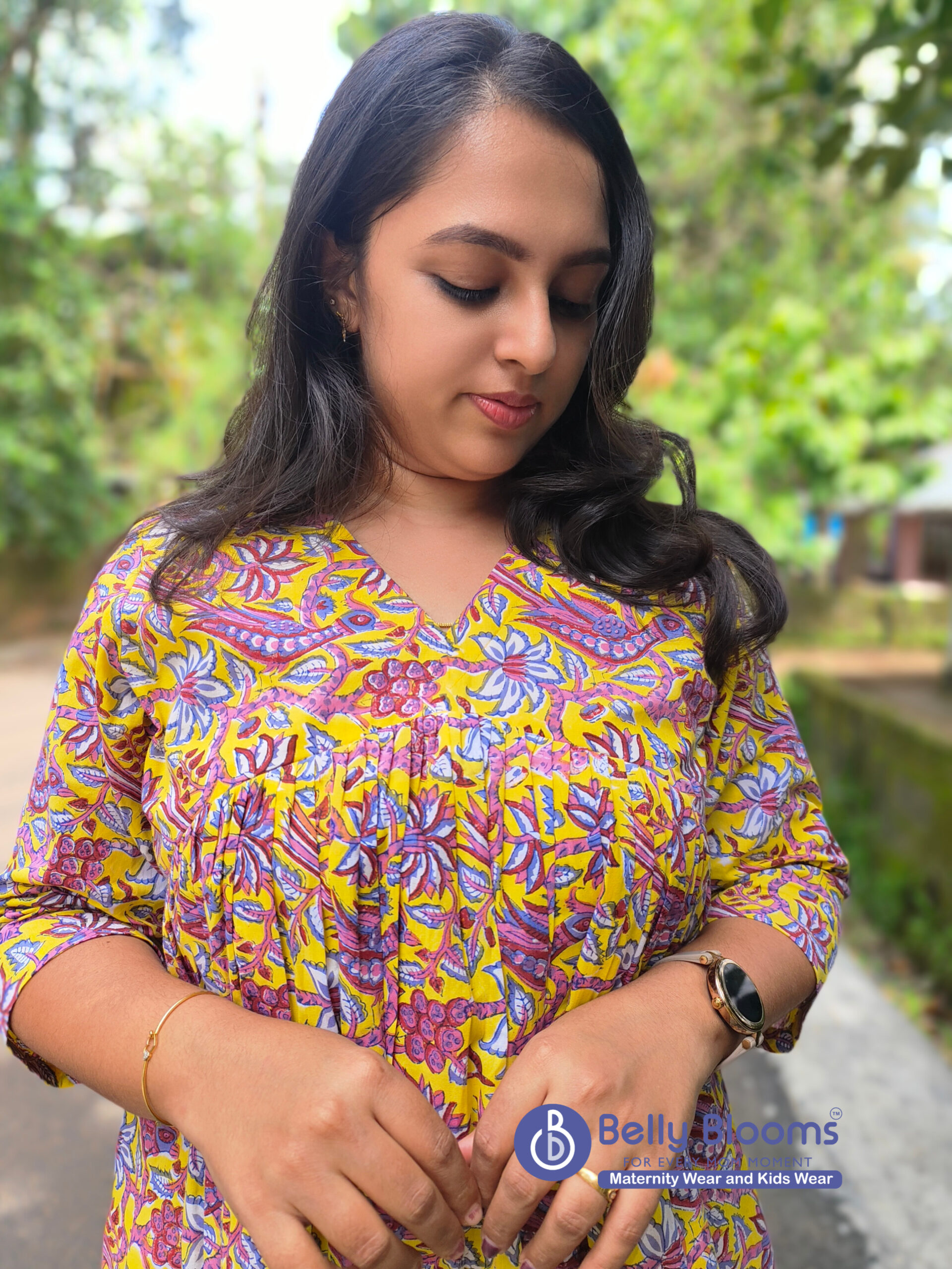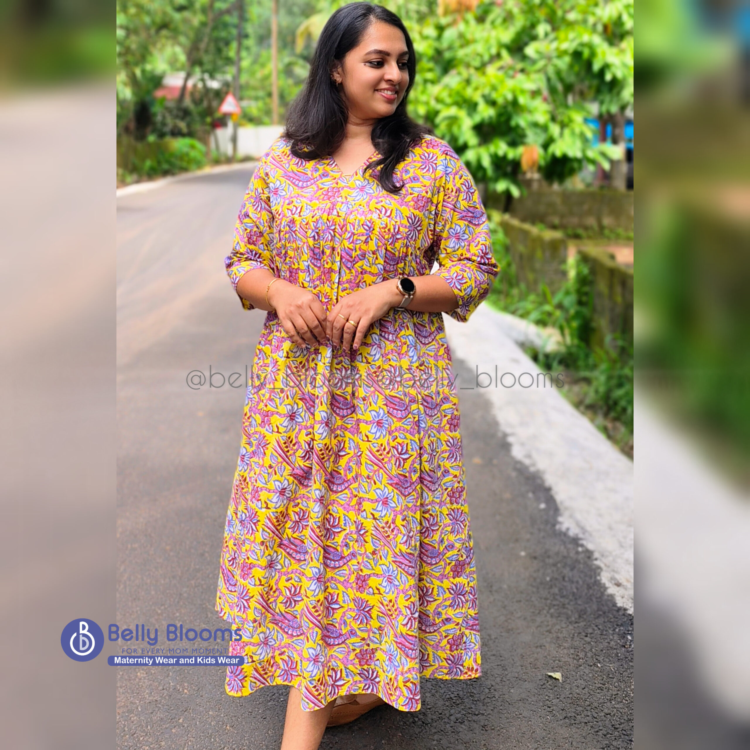 This beautiful piece from belly blooms is both maternity and feeding friendly.Keeping mamma comfy and baby close. Soft jaipur cotton fabric.Whether you’re expecting or nursing this dress is made to support your journey with ease and style.Because every mamma deserves to feel special for herself and her little one